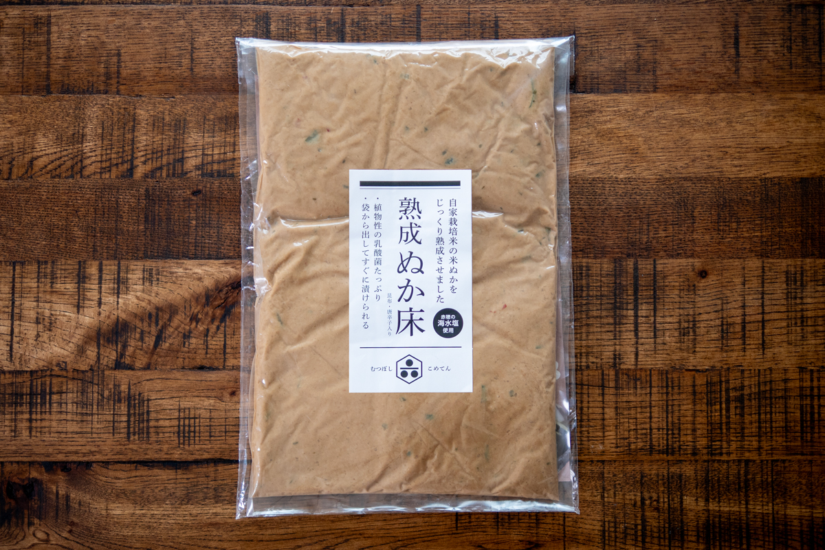 お米の美味しさでは県内でも知名度が抜群の、六星の米ぬかを100%使用した「熟成ぬか床」です。赤穂の天然塩、昆布、唐辛子を入れて熟成させています。保存料、着色料無添加で、野菜を入れるだけで、ぬか漬けが出来上がります。