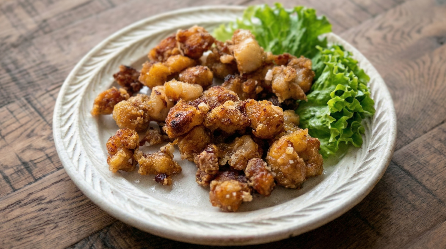 - 170度に温めた揚げ油でこんがり揚げる。
