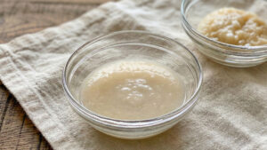 - 甘酒、片栗粉を加えさらに混ぜる。弱火にかけ、木べらでしっかり混ぜる。