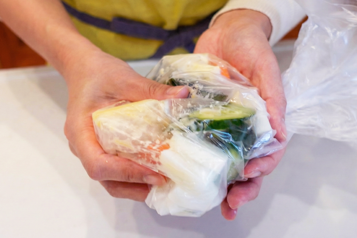 - 野菜を食べやすい大きさに切ってポリ袋に入れ、塩酒粕を加えもみ込む。
