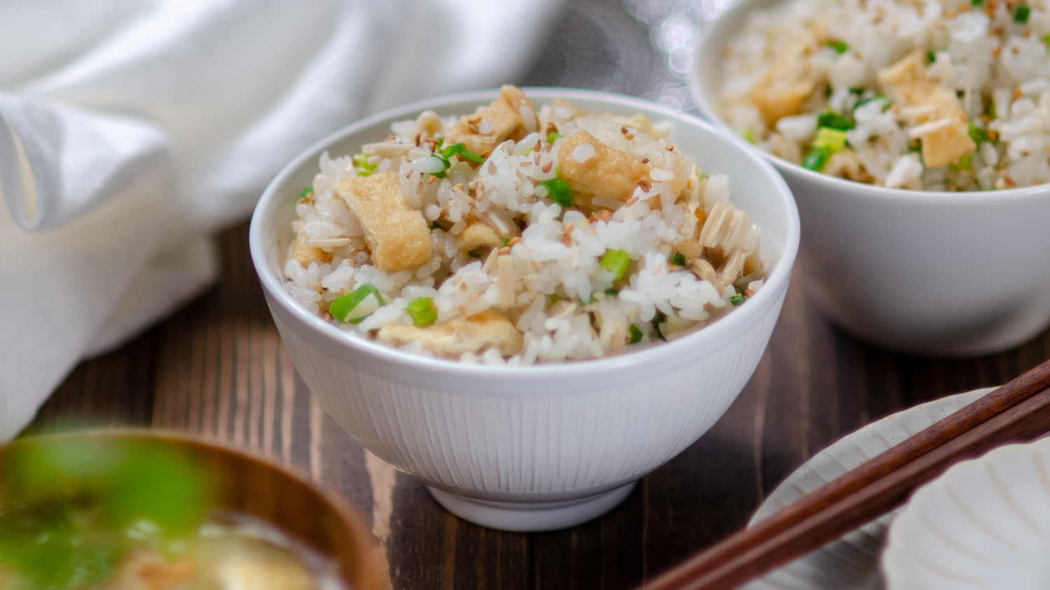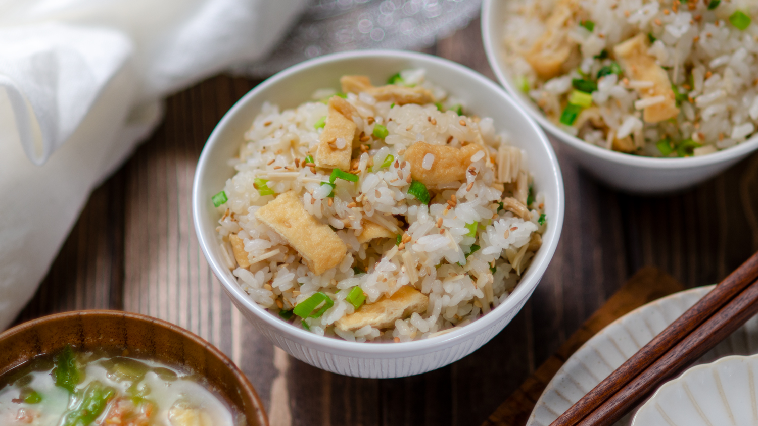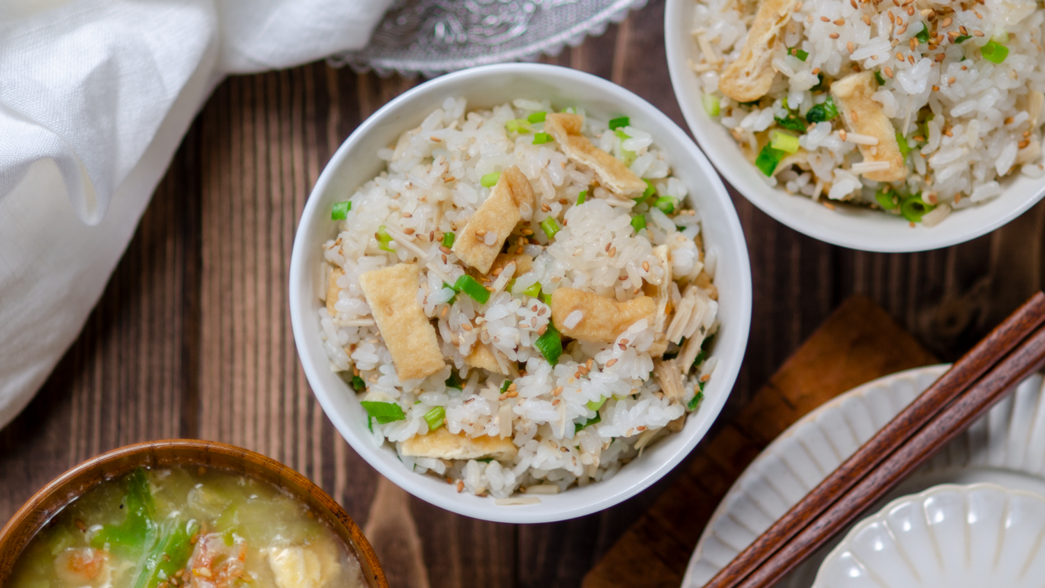 えのきのうま味がぎゅっと染み込んだ塩麹仕立ての炊き込みご飯。シンプルな素材ながら、味付けは塩麹だけで深みのある味わいに仕上がります。油揚げのコクと炊きたてご飯の香りがほっとするような美味しさです。炊飯器に切った材料を入れて炊くだけなので、忙しいけれどしっかり栄養を摂りたいときの夕食や、お弁当、おにぎりにもおすすめです。