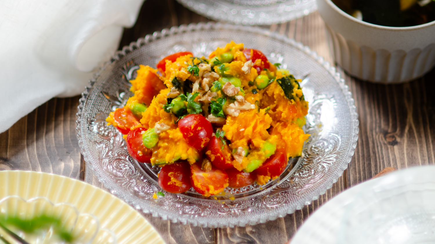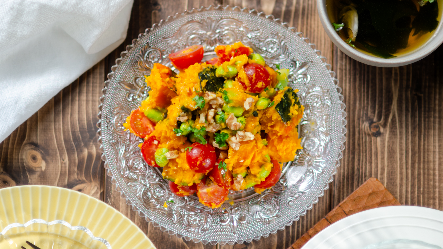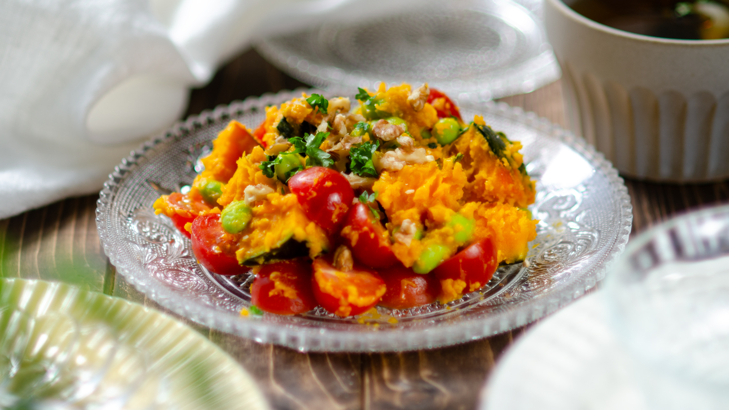 甘みのあるかぼちゃに、爽やかなミニトマトの酸味、ほっくりとした枝豆がよく合うサラダ。マヨネーズは使わず、味付けはシンプルに味噌と酢、米油を混ぜた和風ドレッシング。ほんのりコクのある味噌が素材の甘みを引き立て、さっぱりとした後味が食欲をそそります。野菜の自然な味わいを活かした彩りの良い一品なので、お弁当やおもてなしにもぴったり。子どもから大人まで楽しめる優しい味わいです。