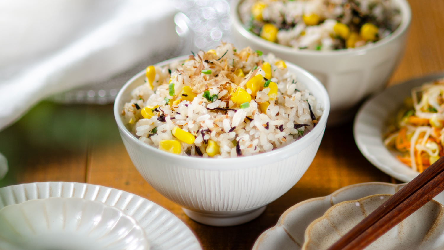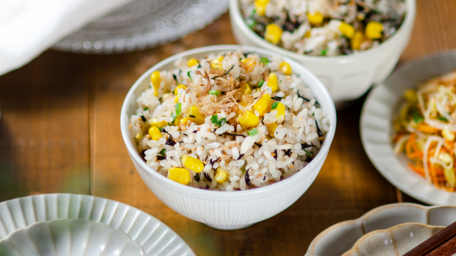 ふっくら炊き上がったご飯に、甘みと香ばしさがじんわりと広がる一品。とうもろこしの粒を丁寧にそぎ、芯ごと一緒に炊き込むことで、実だけでは出せない風味がご飯全体に染み渡ります。塩麹を使うことでとうもろこしの甘みを引き立てながら、深みのある味わいに仕上がります。うま味たっぷりの飽きのこない和風の味わい。お弁当やおにぎりにもぴったりです。