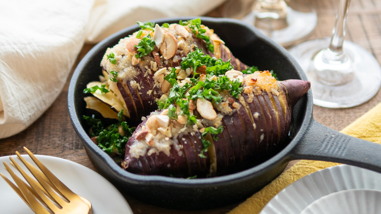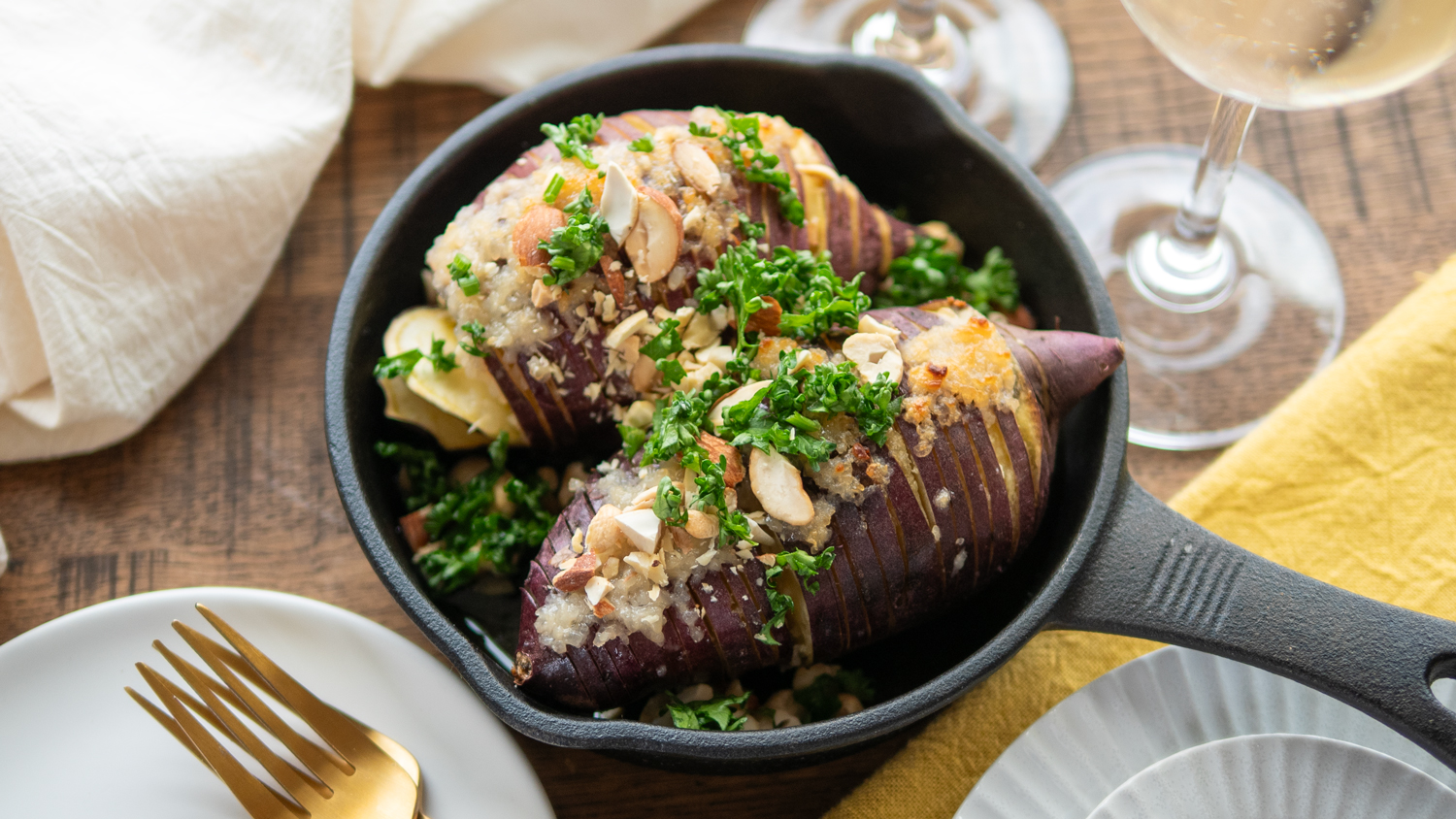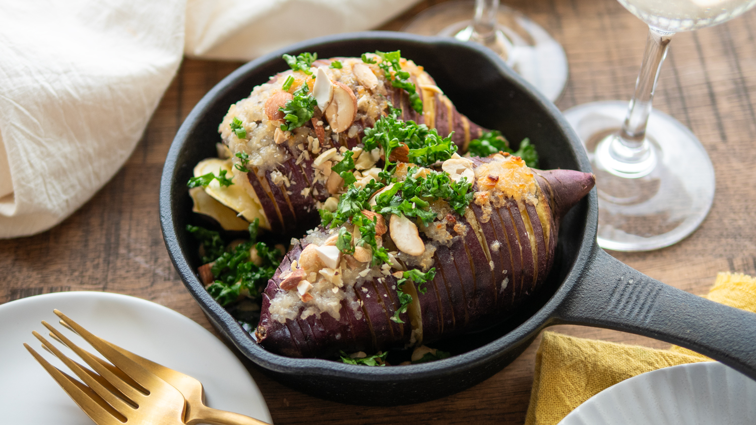 外は香ばしく、中はほっくりと甘いさつまいもで作るハッセルバックポテト。切り込みを入れたさつまいもをじっくり蒸し焼きにしやわらかく仕上げた後、塩麹とオリーブオイルを合わせたタレをたっぷり塗って焼き上げます。塩麹のほんのりとした塩気とコクが、さつまいもの自然な甘さを引き立て、表面は香ばしく、中はほくほく食感に。おかずにもおやつにもぴったりです。