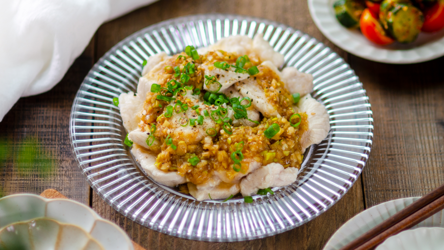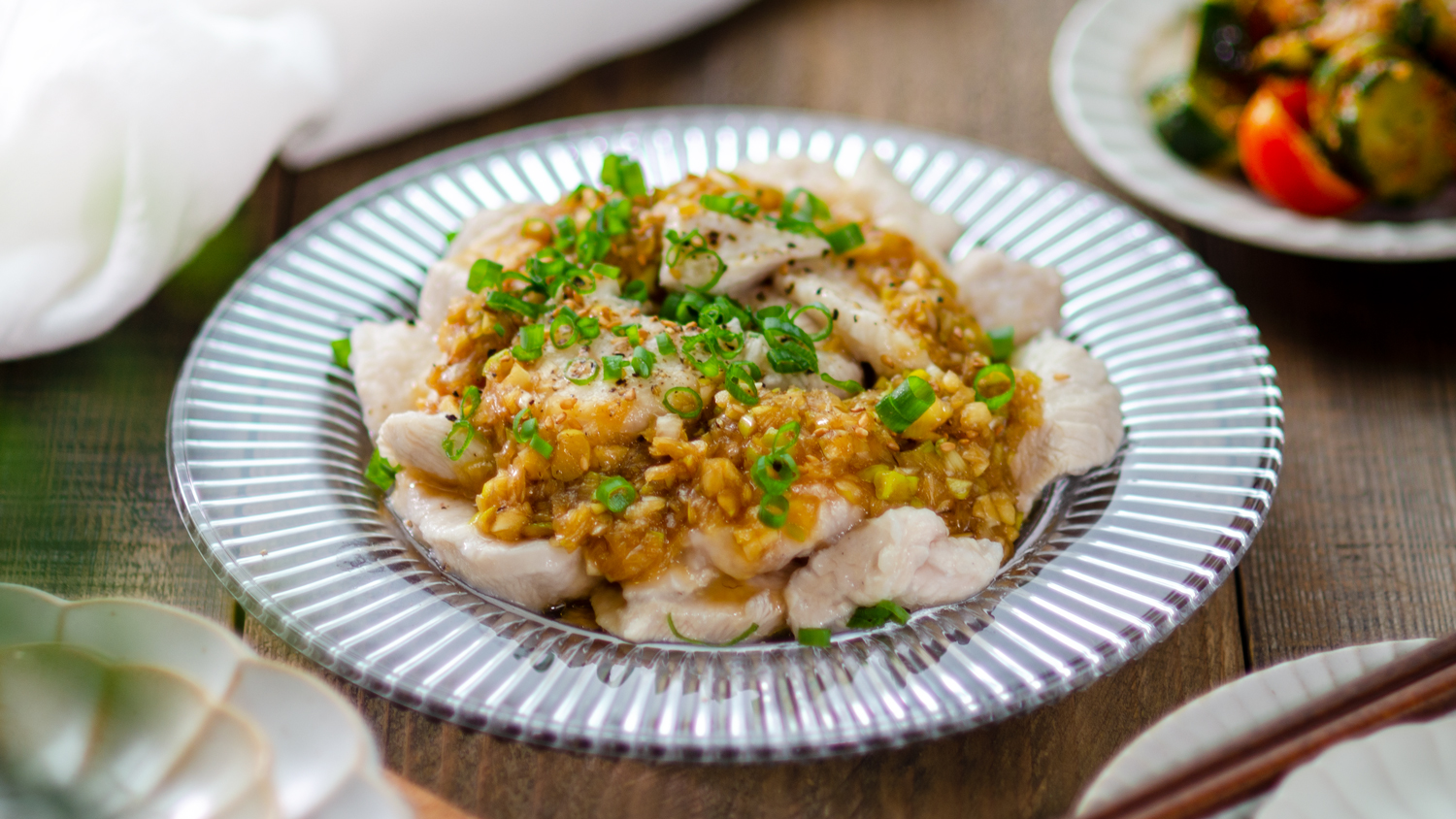 やわらかな鶏むね肉と香ばしいネギダレが絡み合う、さっぱりなのに食べ応え抜群の水晶鶏。鶏むね肉は塩麹に漬け込み、片栗粉をまぶしてから茹でることで、パサつきやすい部位とは思えないほどしっとりジューシーに。表面はつるんとなめらかに、ぷるぷるの食感が楽しめます。シンプルな材料で簡単に作れ、おつまみや前菜、サラダのトッピングにも活用できる万能レシピです。