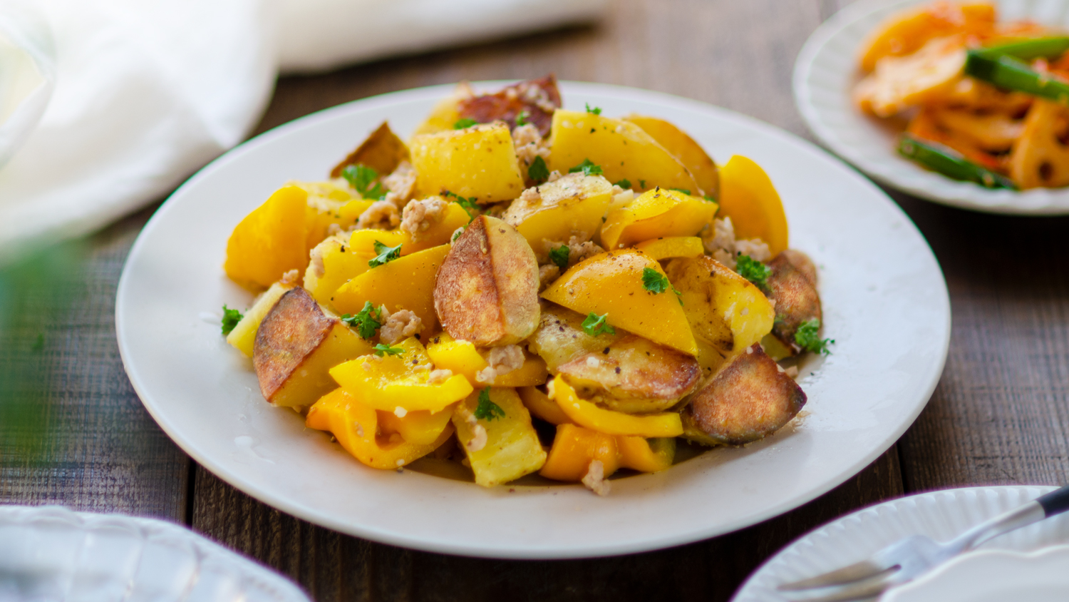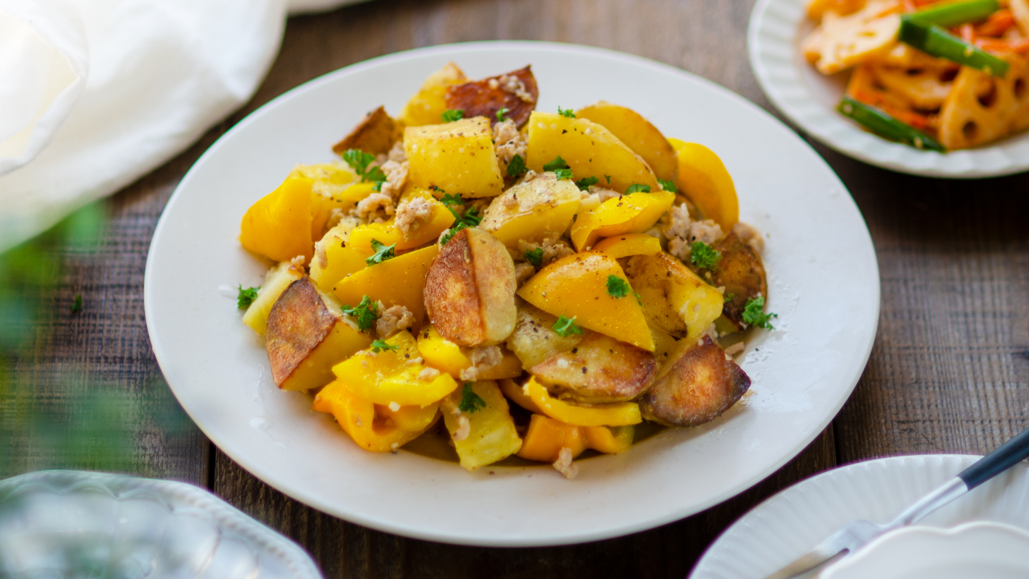 フライパンひとつで完成!ホクホクのじゃがいもにジューシなひき肉が絡む、彩り鮮やかなジャーマンポテト。うま味たっぷりの豚ひき肉とシャキッと炒めたパプリカを合わせ、食べ応え満点。じゃがいもはじっくり蒸し焼きにし、こんがり焼き目を付けるのがポイント。夕食のおかずにはもちろん、ビールやワインのお供にもおすすめの一品です。