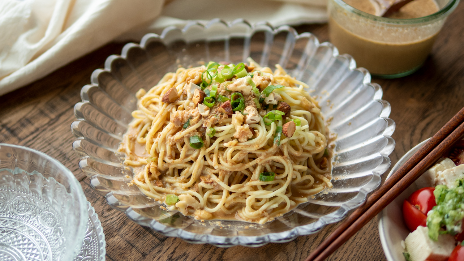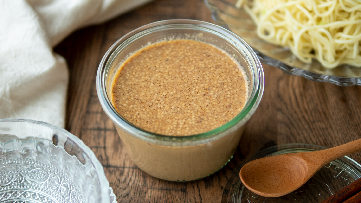 混ぜるだけで完成!砕いたナッツがアクセントのクリーミーな豆乳塩麹だれ。白ゴマと豆乳のコク、ゴマ油の香りが食欲そそるまろやかな味わい。冷たい麺、豆腐、トマト、焼きナス、冷しゃぶなどいろんなものにかけて使えます。茹でて冷やした麺に、ひき肉とラー油と一緒にかけて、冷やし担々麺風にするのもおすすめ。火を使わず混ぜ合わせるだけでできる、お手軽万能だれです。