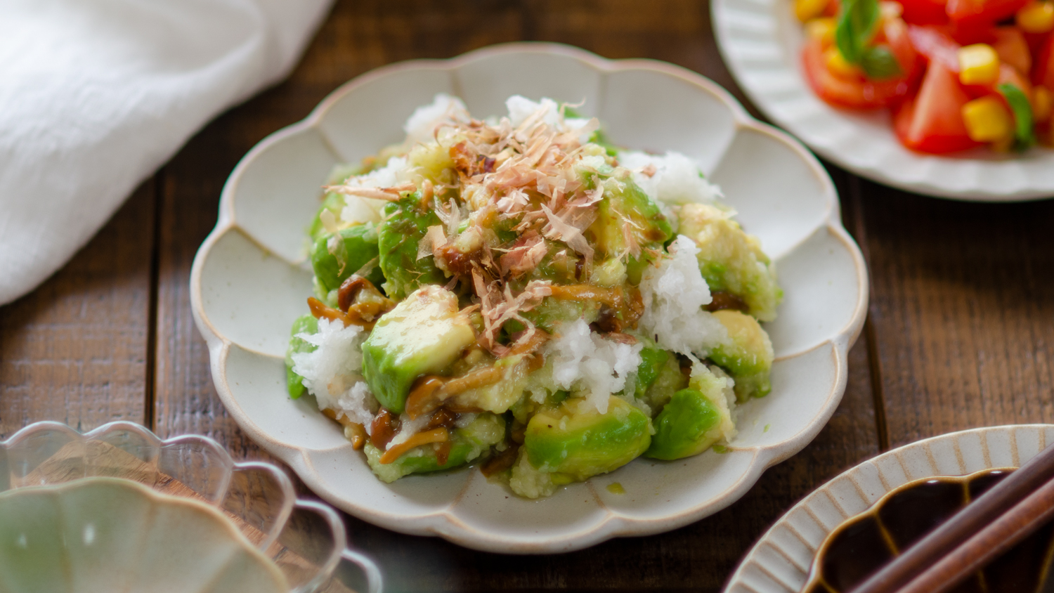 アボカドとなめこ、大根おろしを組み合わせたするっと食べられる一品。クリーミーなアボカドに、つるんとした食感のなめこが相性抜群。大根おろしを加えることで、全体の味わいがさっぱりと引き締まります。冷やしても美味しいのでおつまみとしてはもちろん、ご飯のお供や副菜としても活躍してくれます。薬味を加えてアレンジするのもおすすめ。