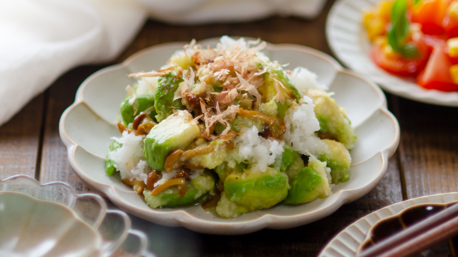 アボカドとなめこ、大根おろしを組み合わせたするっと食べられる一品。クリーミーなアボカドに、つるんとした食感のなめこが相性抜群。大根おろしを加えることで、全体の味わいがさっぱりと引き締まります。冷やしても美味しいのでおつまみとしてはもちろん、ご飯のお供や副菜としても活躍してくれます。薬味を加えてアレンジするのもおすすめ。
