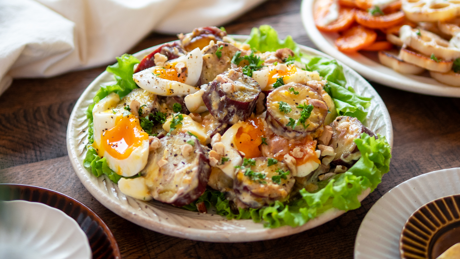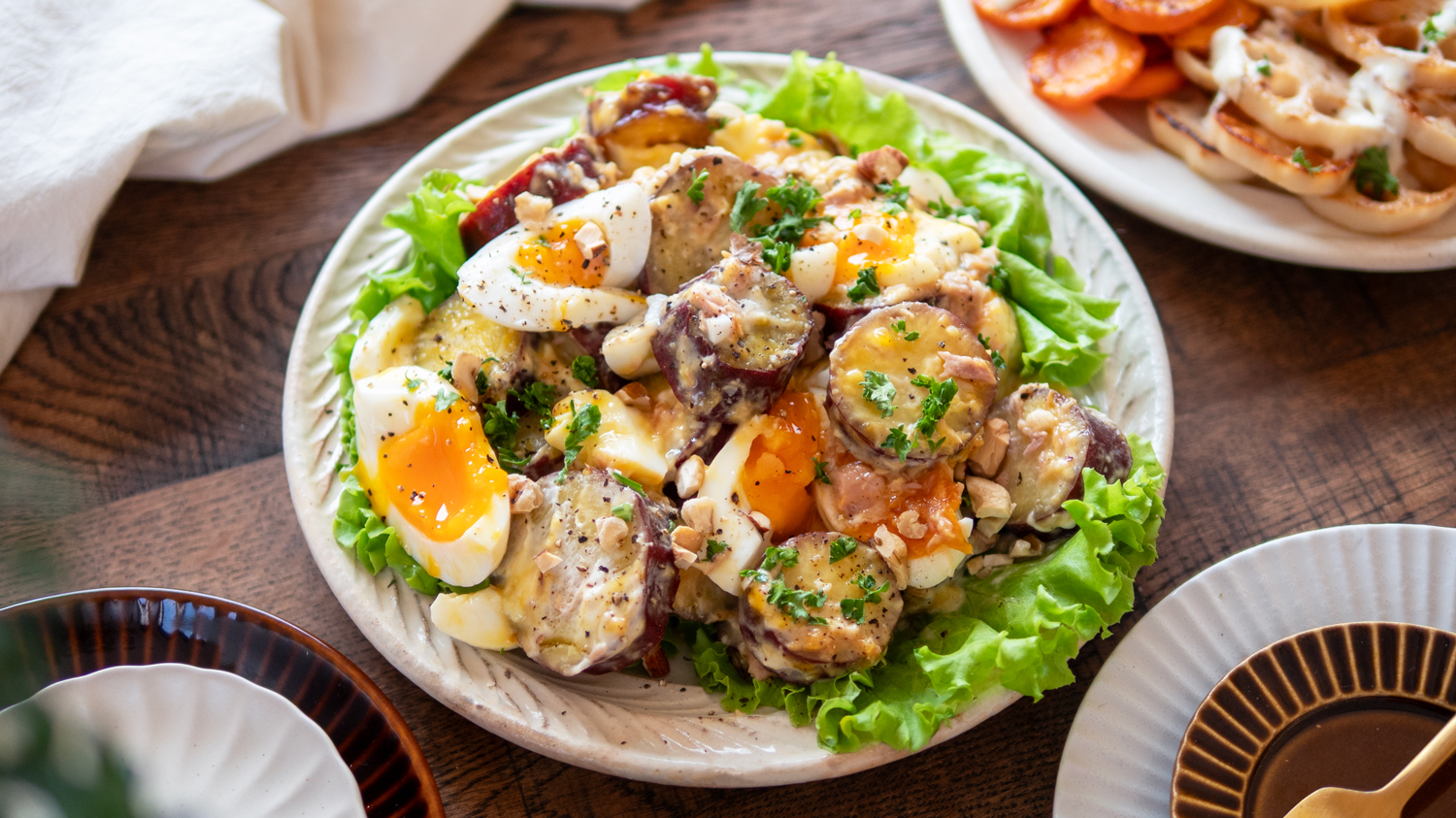 しっとりほくほくのさつまいもに、まろやかな半熟卵を合わせたごちそう感のあるサラダ。ヨーグルトを加えることで重たさのない爽やかなコクとクリーミーさが加わり、マヨネーズを使わなくても満足感のある味わいに仕上がります。栄養バランスも良く、おかずとしてはもちろん、パンやクラッカーに添えても相性抜群。おもてなしの一品としても映える華やかな一品です。