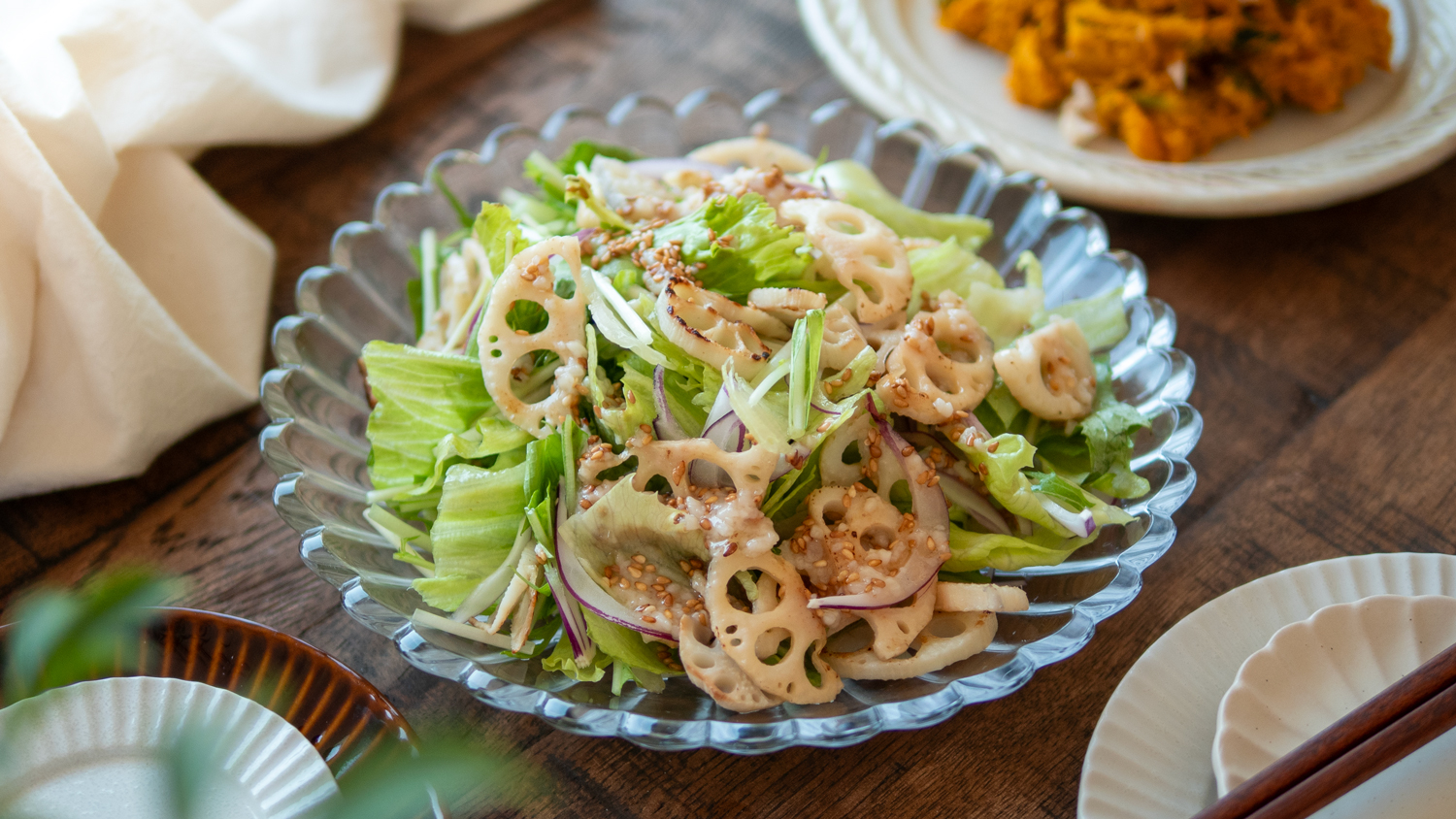シャキッとした歯ごたえと香ばしさが美味しいれんこんサラダ。れんこんは茹でるのではなく、フライパンで両面をこんがりと焼くことで表面はカリッと香ばしく仕上がります。ドレッシングには、塩麹のまろやかな塩味と相性の良いゴマ油を合わせました。生野菜はお好きなものでアレンジ可能。レタスやベビーリーフ、キュウリ、パプリカなど彩りのよいものを合わせれば、見た目にも鮮やかで食欲をそそる一皿に。このドレッシングは覚えておくと色んなサラダに使えて便利です。
