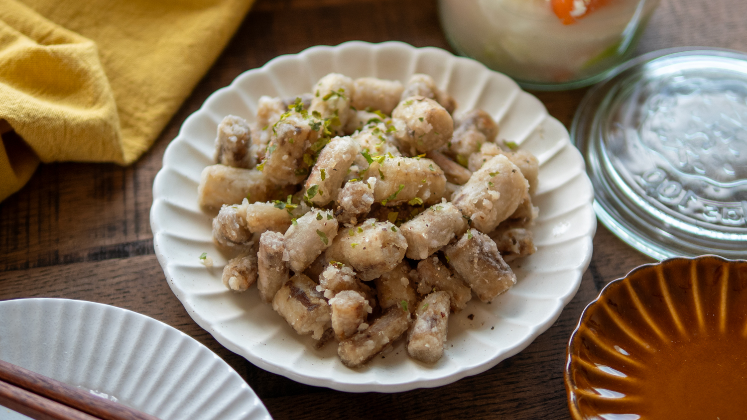 少ない油でカリッと食感のヘルシーなゴボウの唐揚げ風。ゴボウといえば煮物やきんぴらのイメージが強いですが、こんがり焼くことでまた違った味わいが楽しめます。おかずとしてはもちろん、お酒のおつまみにもぴったり。おやつにもなる子ども喜ぶメニューです。少量の油で香ばしく焼くので、油の後処理もいらず揚げ物をするより手軽に作れますよ。
