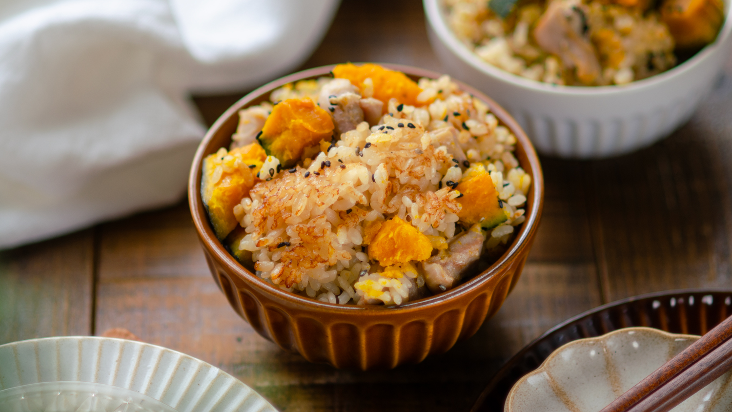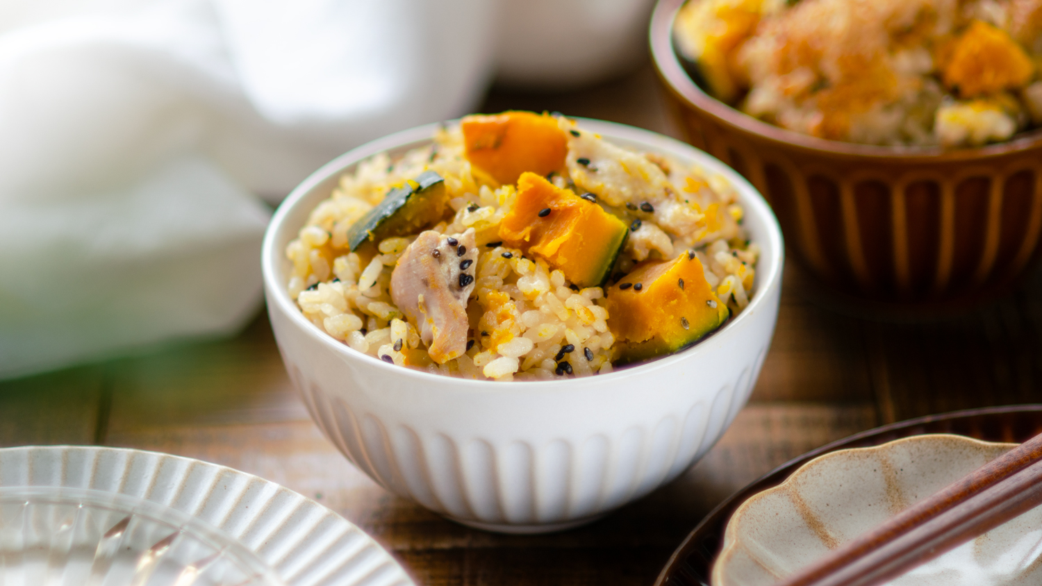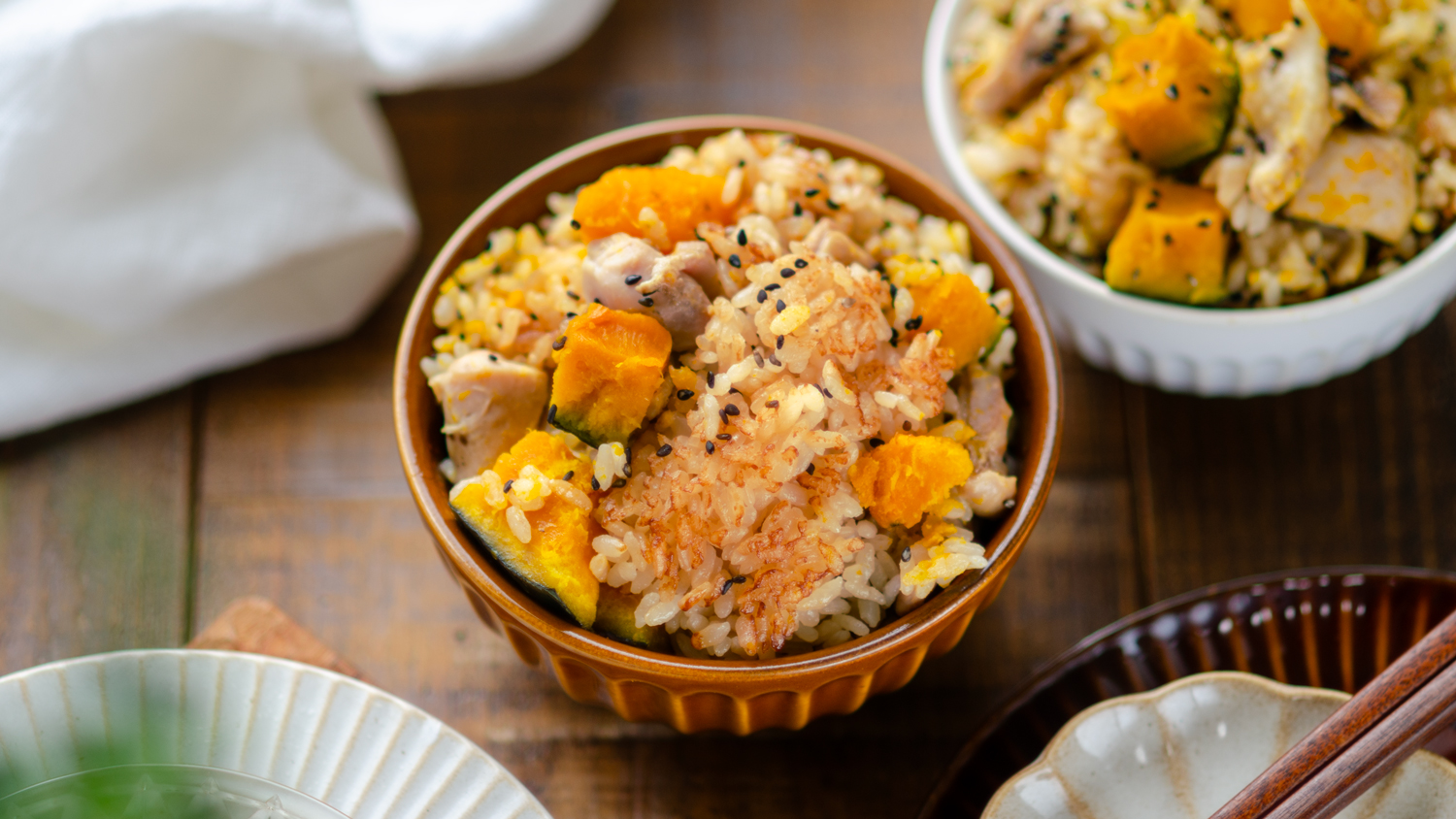 ホクホクのかぼちゃとうま味あふれる鶏肉を組み合わせた、ほっとする味わいが魅力の炊き込みご飯。鶏肉は塩麹をもみ込んでおくことで下味が付き、やわらかくジューシーに仕上がります。かぼちゃは炊き込むことでほっくり食感に仕上がり、香ばしい風味と彩りをプラス。自然な甘さが広がります。お弁当にもぴったりな思わずおかわりしたくなる一品です。