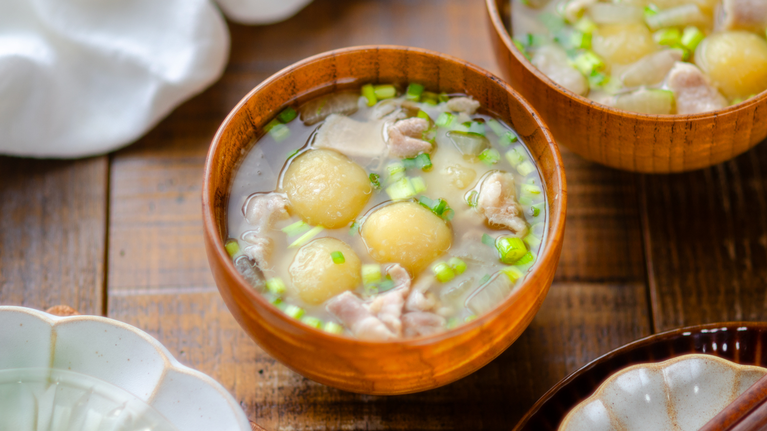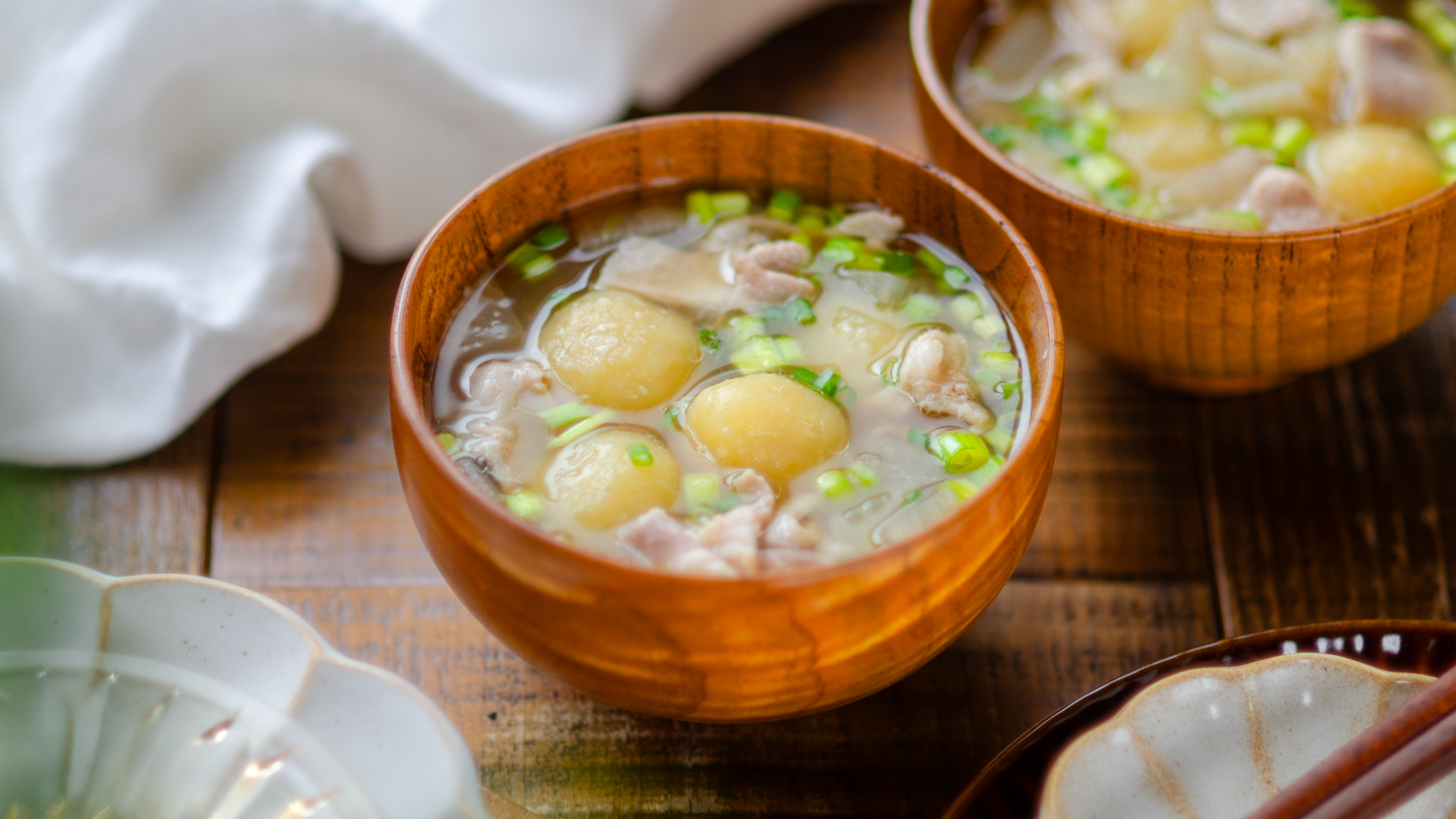 だし汁不要で美味しい、さつまいものもちもち団子の豚汁。味付けは塩麹と味噌を使い発酵のコクとまろやかさをプラス。豚肉のコクとうま味、大根の瑞々しさが溶け出したスープが優しい甘みのさつまいもによく合います。ふかし芋や焼き芋が余ったときのリメイクにもおすすめ。秋冬の食卓にはもちろん、季節を問わずほっと一息つきたい時にぴったり。