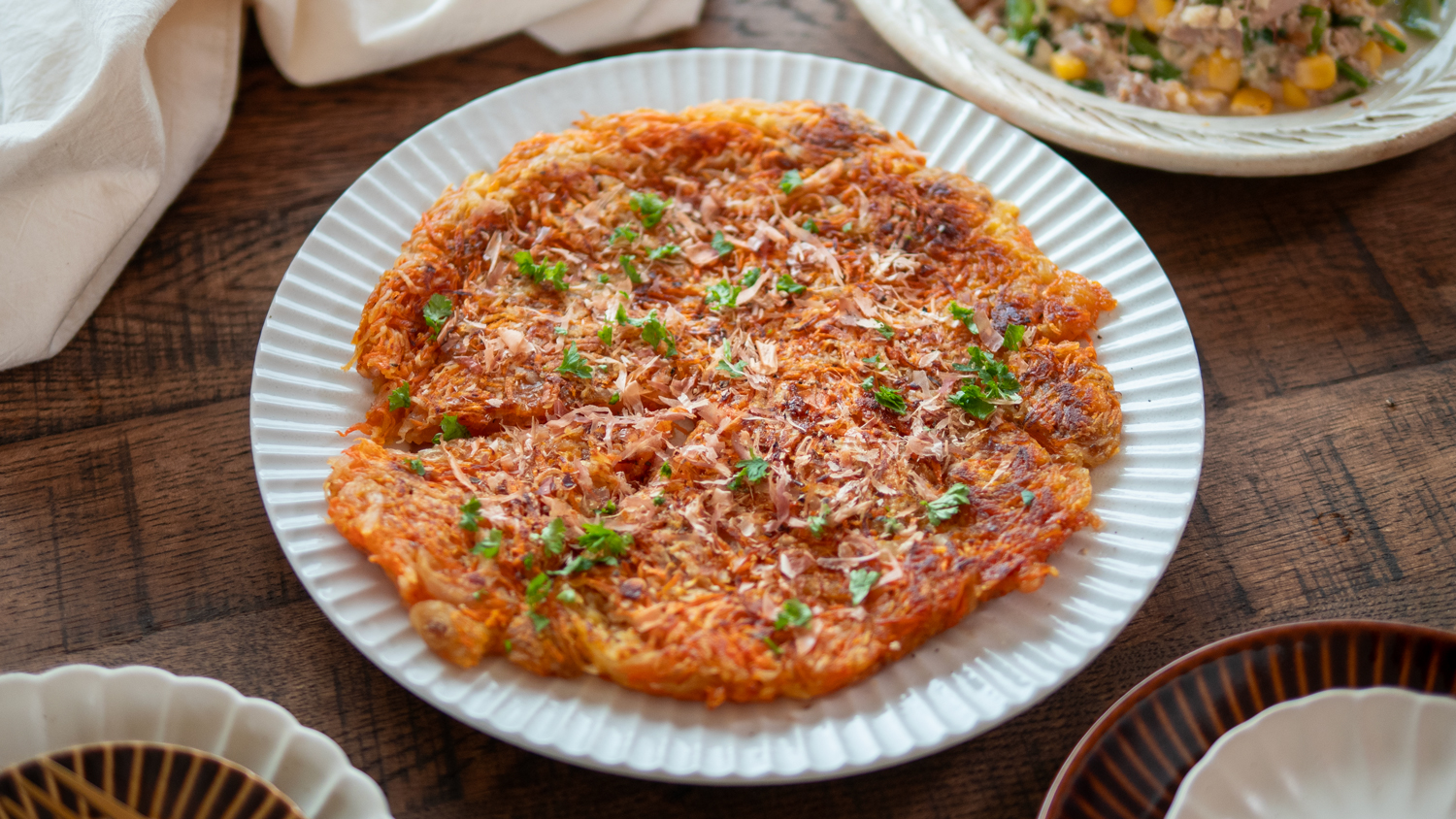 香ばしい香りが食欲をそそるじゃがいもとニンジンのガレット。表面はこんがりと香ばしく、中はホクホクもちもちの食感が楽しめます。かつお節を混ぜ込むことで和の深いうま味が加わり、副菜としてはもちろん、軽食やおつまみにもぴったり。じゃがいもは水にさらさずにそのまま使うことで、デンプンの力が片栗粉と合わさりもっちりとした食感に仕上がりますよ。