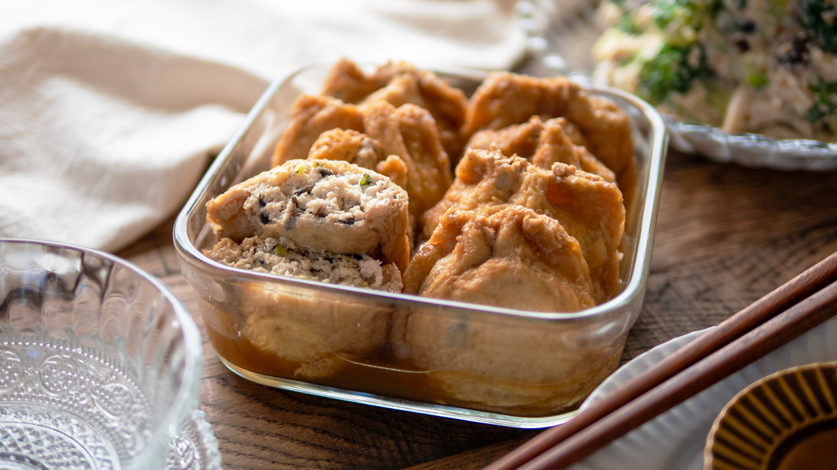 豆腐を使ったじゅわっと美味しい油揚げ包み。鶏ひき肉に絹ごし豆腐を混ぜることで、ふんわりとした軽やかな優しい口当たりに。塩麹で下味をつけてから煮込んでいるので、しっかり中まで味が染み込み、食べると甘辛い煮汁のうま味のあふれます。定番おかずとしてはもちろん、冷めても美味しいのでお弁当にもぴったり。ホッとする味わいの和の魅力が詰まった煮込み料理です。