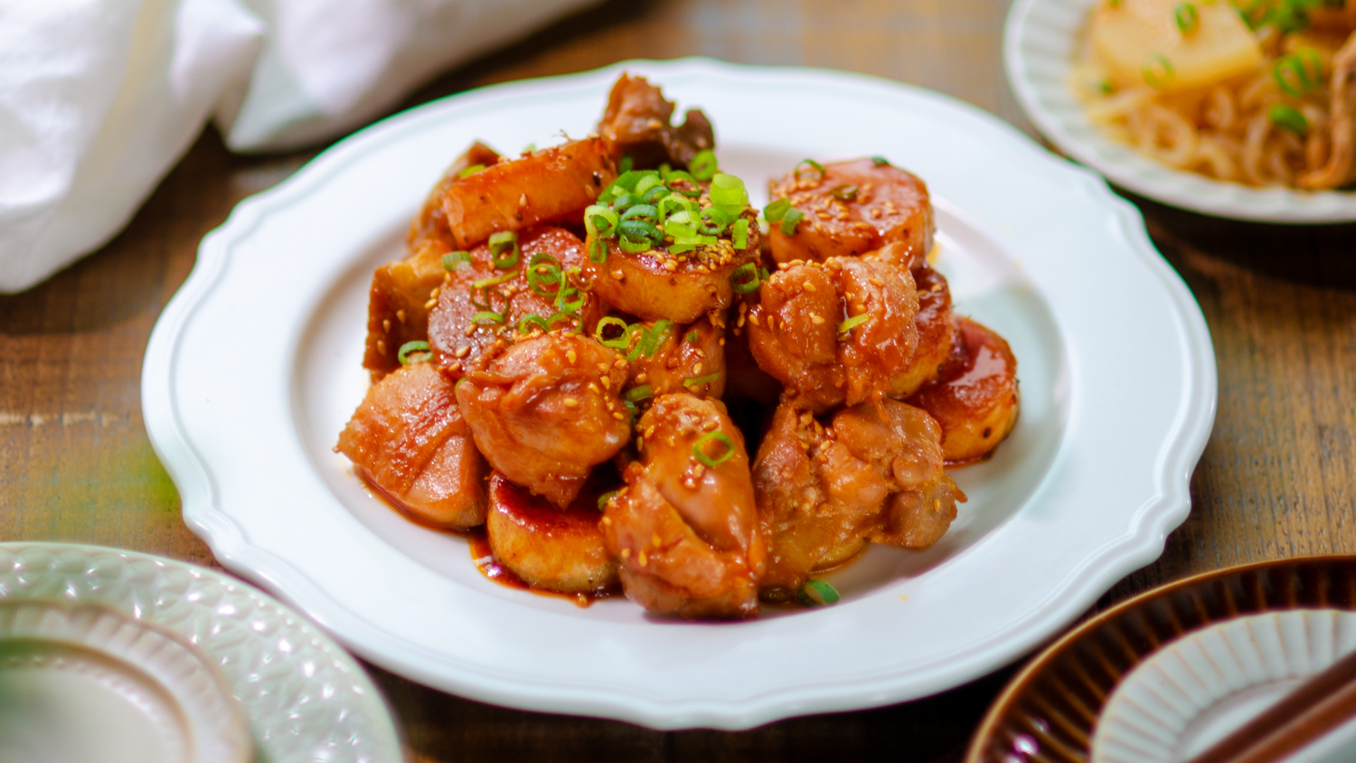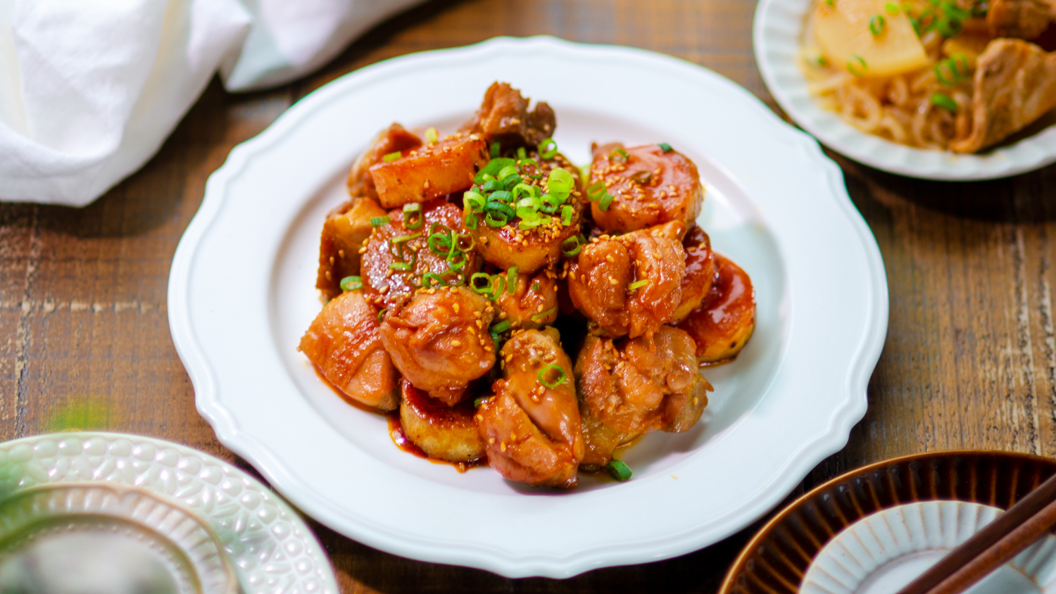 こんがり焼けた鶏もも肉と、ほくほく&シャキッとした長芋の食感が絶妙にマッチする韓国風のピリ辛おかず。塩麹で下味をつけた鶏肉はやわらかく、うま味が引き立ちます。甘辛い醤油ベースのタレに、コチュジャンとニンニクを加えることで、ピリッとした辛みと香ばしさが広がり、食欲をそそる深みのある味わいに。ご飯との相性も抜群で、思わずおかわりしたくなる美味しさ。