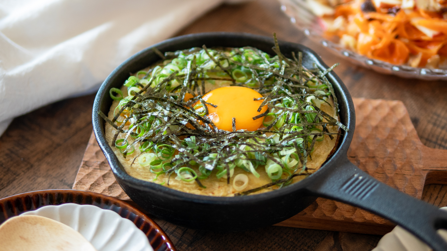 4. 焼き色が付いたら小ネギ、刻み海苔を散らし好みで卵黄(分量外・1個)を乗せる。