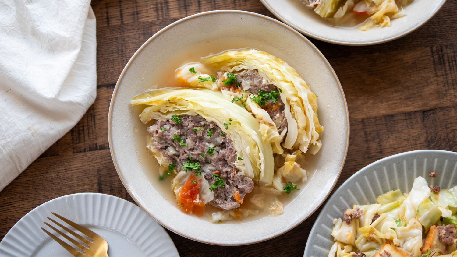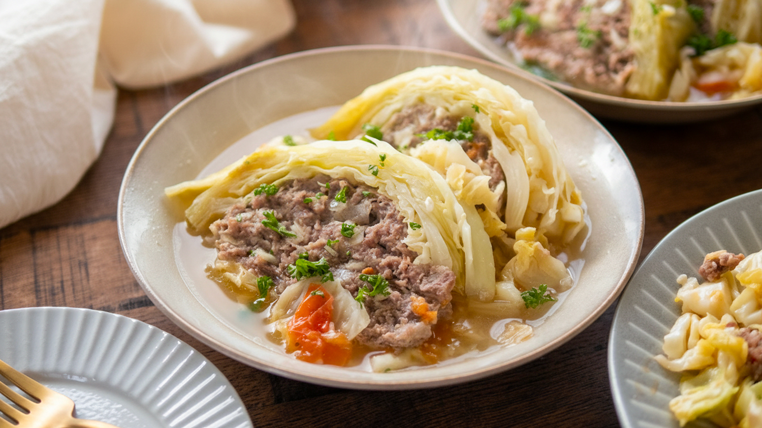 味付けは塩麹だけなのにコンソメ不要で美味しい、巻かないロールキャベツ。キャベツの葉を1枚ずつ剥がしたり、ひとつずつ包む手間がないので楽ちん。肉ダネをキャベツの中に詰めて、お鍋に入れたらあとはほったらかし。シンプルな味付けですが、麹のコクで物足りなさがなく絶品の仕上がりです。春キャベツ、普通のキャベツ、どちらでもお作りいただけます。