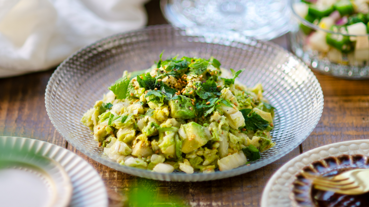 白菜とアボカドを使ったクリーミなゴマサラダ。白菜は塩麹で軽くしんなりさせることで水分が適度に抜け、甘みが引き立つだけでなく味がからみやすくなります。練りゴマが加わることで濃厚さが増しリッチな味わいに。アボカドのねっとりとした食感と爽やかな大葉がアクセントとなり、箸が止まらない美味しさ。普段の食卓にはもちろん、作り置きやおつまみにもぴったり。