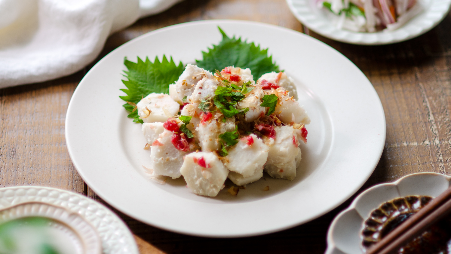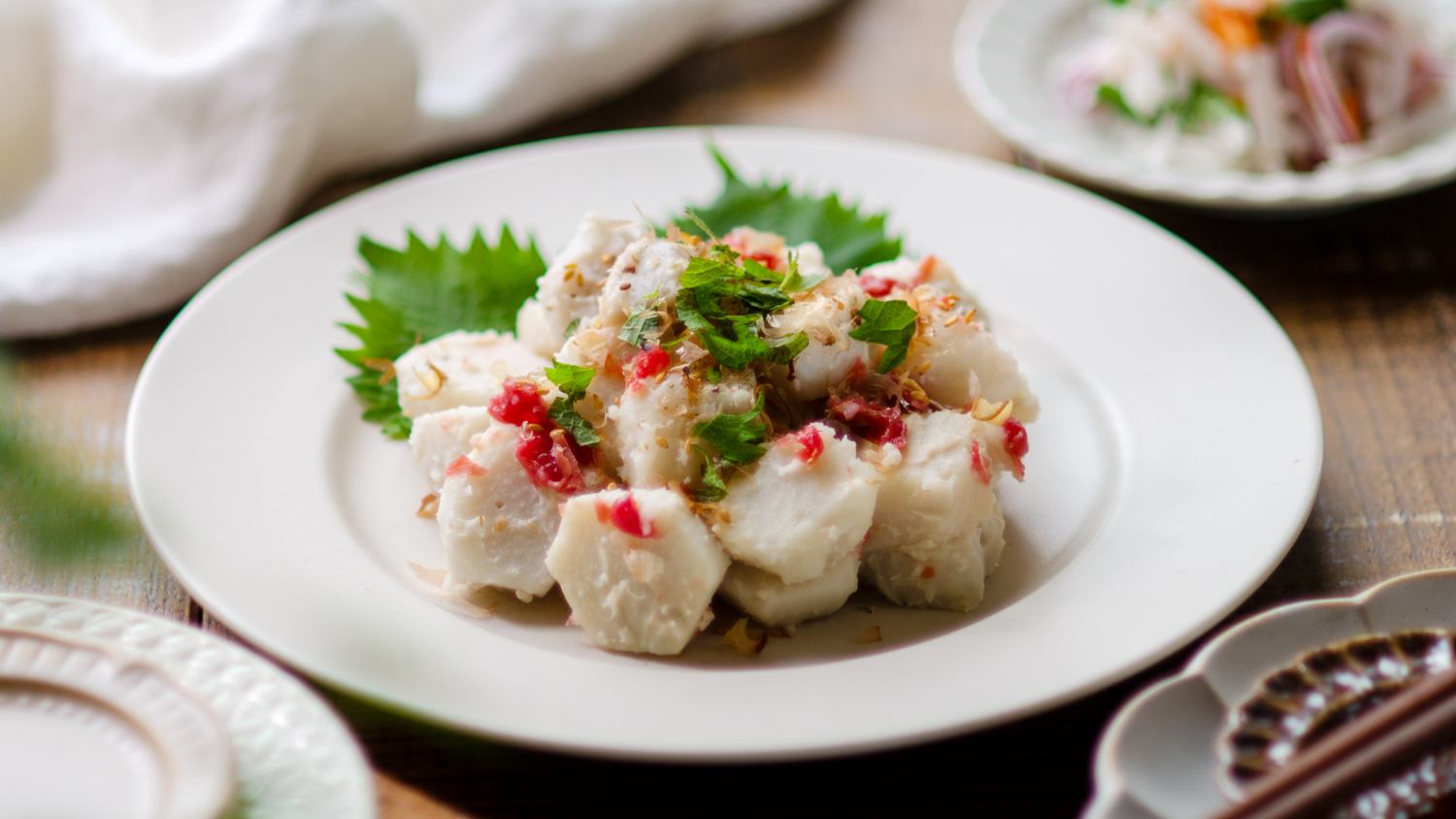 里芋と梅のほっくり煮。やわらかな里芋と梅の酸味が相性抜群。下茹で不要で、里芋と調味料を鍋に入れて火にかけるだけ。塩麹の塩気が里芋の自然な甘みを引き立て、とろりとした食感を味わえます。仕上げの大葉とかつお節の風味もアクセント。副菜としてはもちろん、冷やして食べても美味しく、お弁当のおかずにもぴったり。