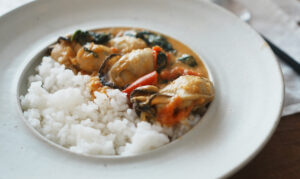 - 鍋に米油をひき鶏肉を入れ、中火で表面焼き色をつける。