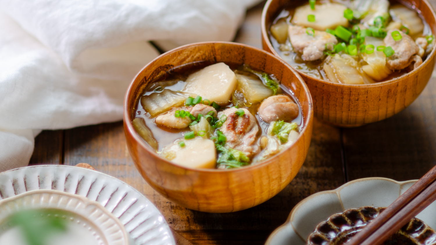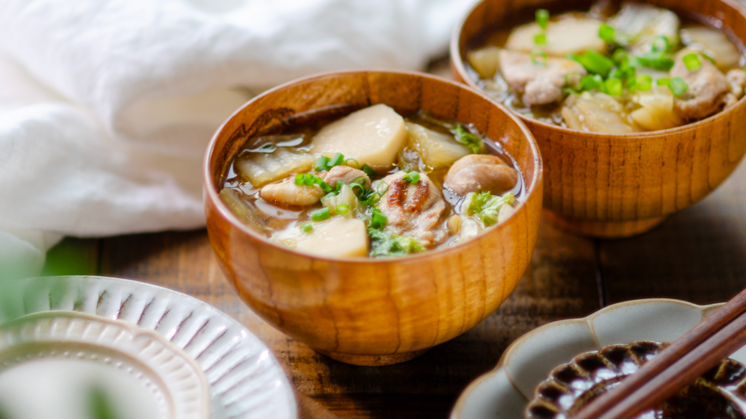 やわらかな白菜とほっくり里芋の鶏のお味噌汁。鶏肉に塩麹をもみ込む一手間でしっとりやわらかく仕上がり、煮ても固くならず、煮汁全体にまろやかなコクが加わります。鍋で軽く焼きつけることで香ばしさが立ち、野菜にも風味がしっかり移ります。白菜は火が通ると甘みが増し、里芋はホクホクとろりとした食感と相性抜群。具材から出るうま味でだし汁いらず。生姜が効いた食べ応えのある優しい味わいです。