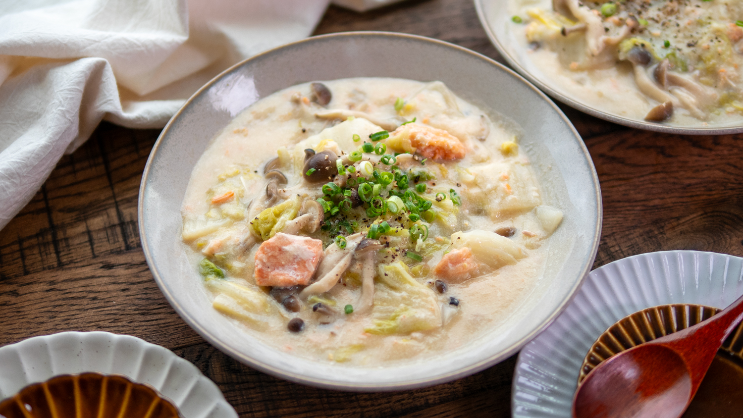 とろとろやわらかい白菜のうま味たっぷりクリーム煮。お味噌を隠し味に使い、ヘルシーなのに物足りなさのないコクのある仕上がり。豆乳との相性は抜群。子どもから大人まで喜ばれるマイルドな味付けです。手軽に作れる寒い日にぴったりな、体も心も温まる一品。何度でも食べたくなるようなほっとする味わいです。