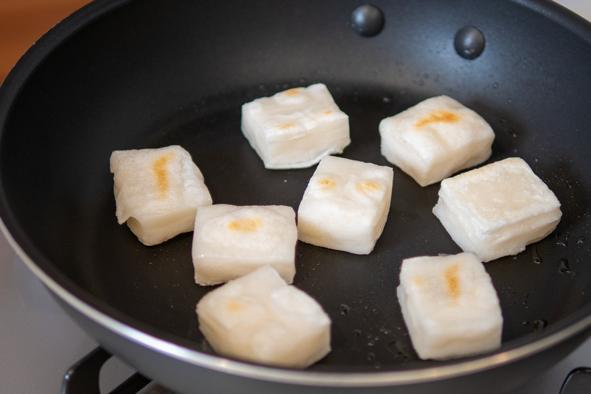 2. フライパンに油(分量外・適量)をひいて、餅を並べ両面こんがり焼き、皿に盛る。