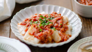 - お餅は煮汁に入れて煮込むと溶けすぎてドロドロになってしまうことがあるので、今回は別で用意して合わせるスタイルにしています。器に盛る直前に、あつあつの状態にしておきましょう。