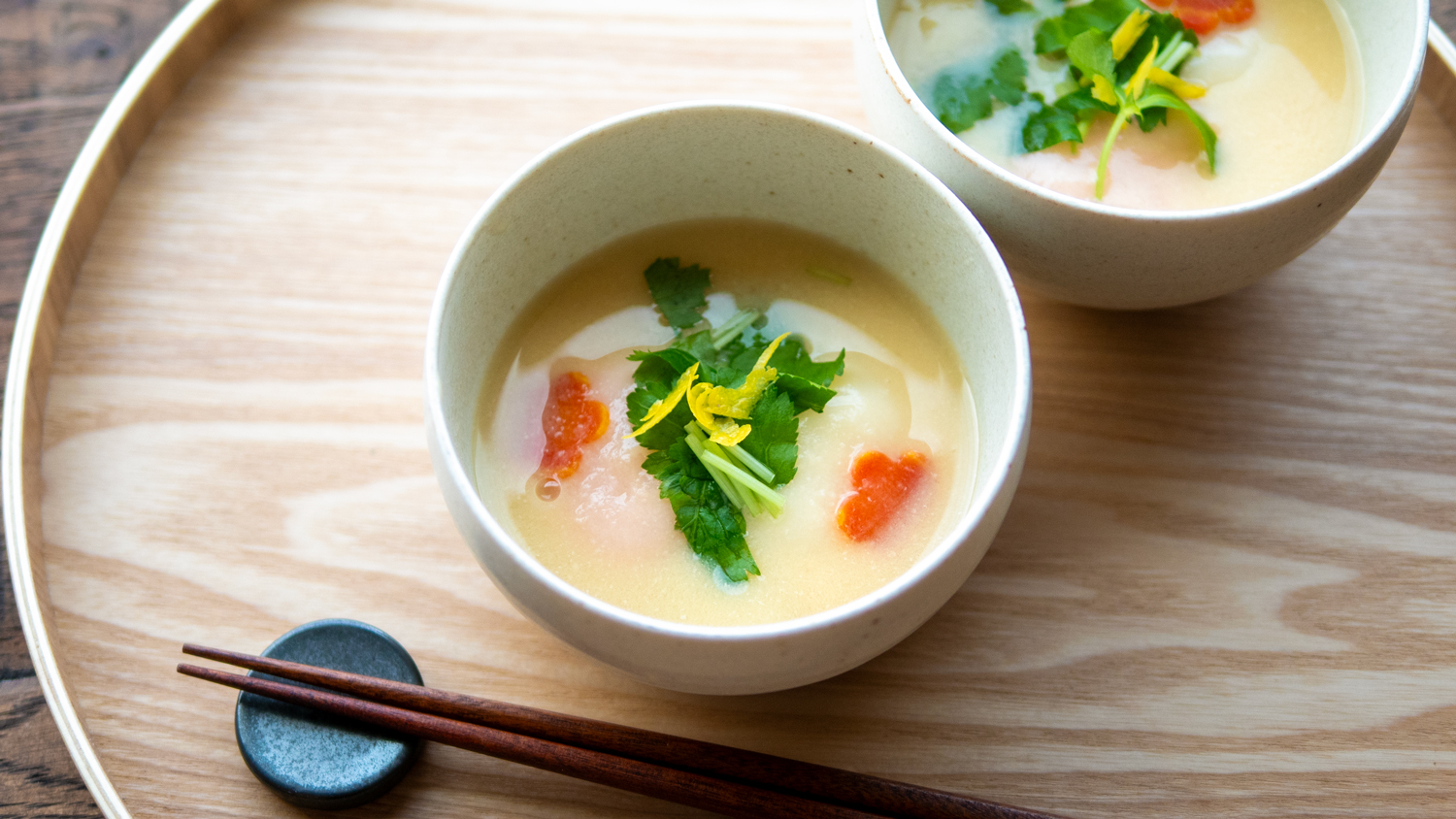 - 器に里芋、ニンジン、餅を入れ煮汁を注ぎ、刻んだ三つ葉、ゆずの皮の千切りを添える。