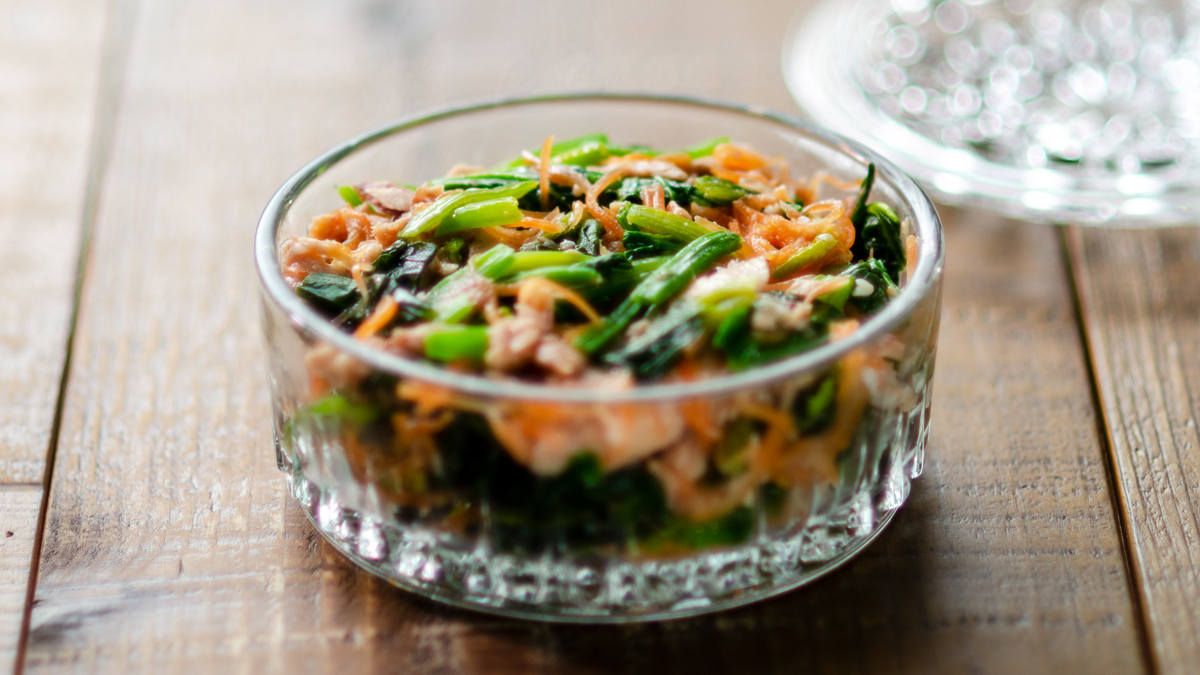 ボウルひとつで完結する時短副菜、ほうれん草とツナの塩麹和えのレシピをご紹介。作り方は簡単、切った野菜に熱湯をかけて、調味料と和えるだけ。ほうれん草とニンジンを、うま味たっぷりのツナと塩麹で和えるだけ。鍋を使わないので洗い物も少なく、パパっと完成。塩麹のコクで野菜の甘みが引き立ち、野菜嫌いのお子様でもパクパク食べられますよ。忙しい日の副菜や、彩りが欲しいお弁当のおかずにぜひ活用してください。