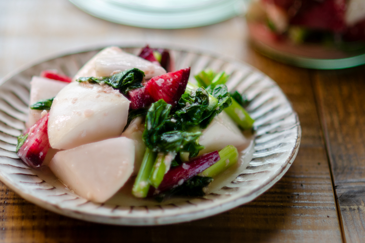 - カブの皮は薄くて柔らかいので、むかずにそのまま使うとポリポリとした食感が楽しめます。より口当たりを優しくしたい場合は、皮をむいて調理してください。