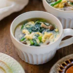 - 豆乳(または牛乳)と米粉を混ぜ合わせて入れ、塩麹、ほうれん草、ツナ缶を加え合わせる。