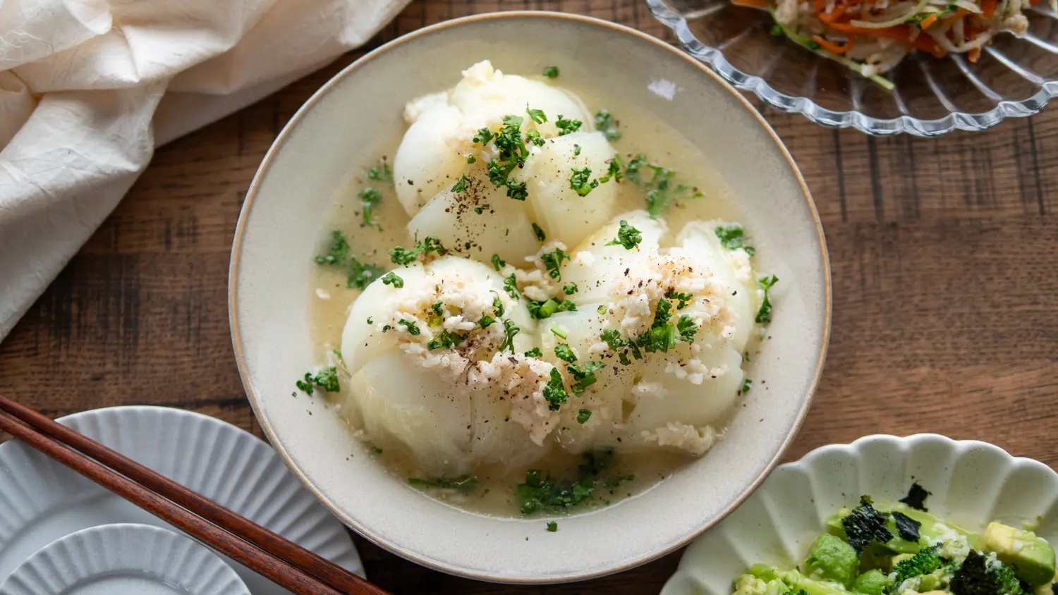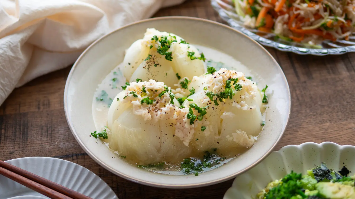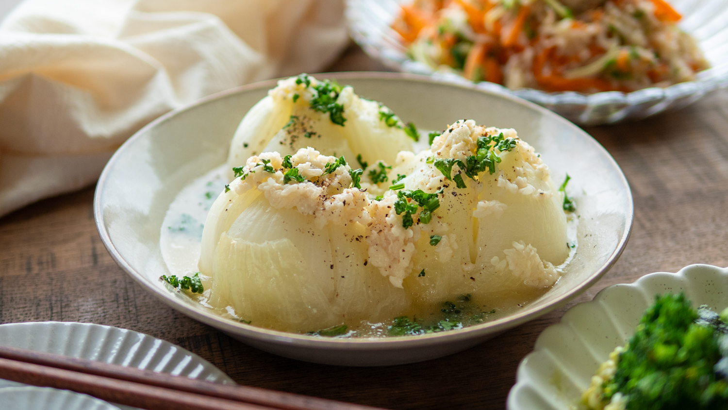 また、栄養面では、新玉ねぎに多く含まれるビタミン類などの水溶性の栄養素に注目。これらは茹でるとお湯に溶け出しやすい性質がありますが、今回のように少量の水で蒸し煮にすることで、栄養成分を逃さず丸ごと摂取しやすくなると考えられています。じっくり加熱して甘みを引き出す調理法は、美味しさだけでなく、体をいたわりたい時にもぴったりです。