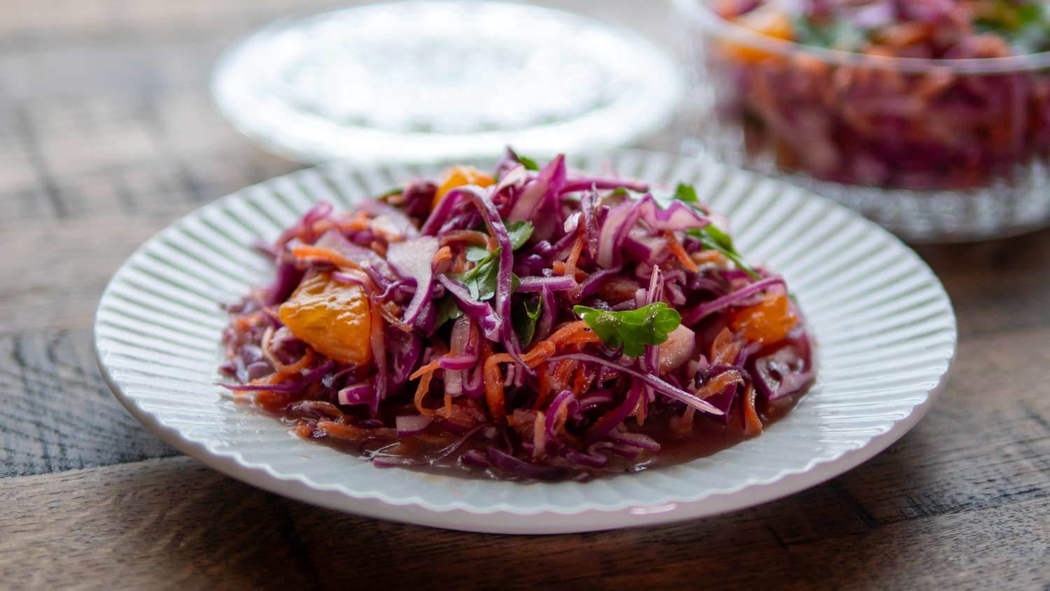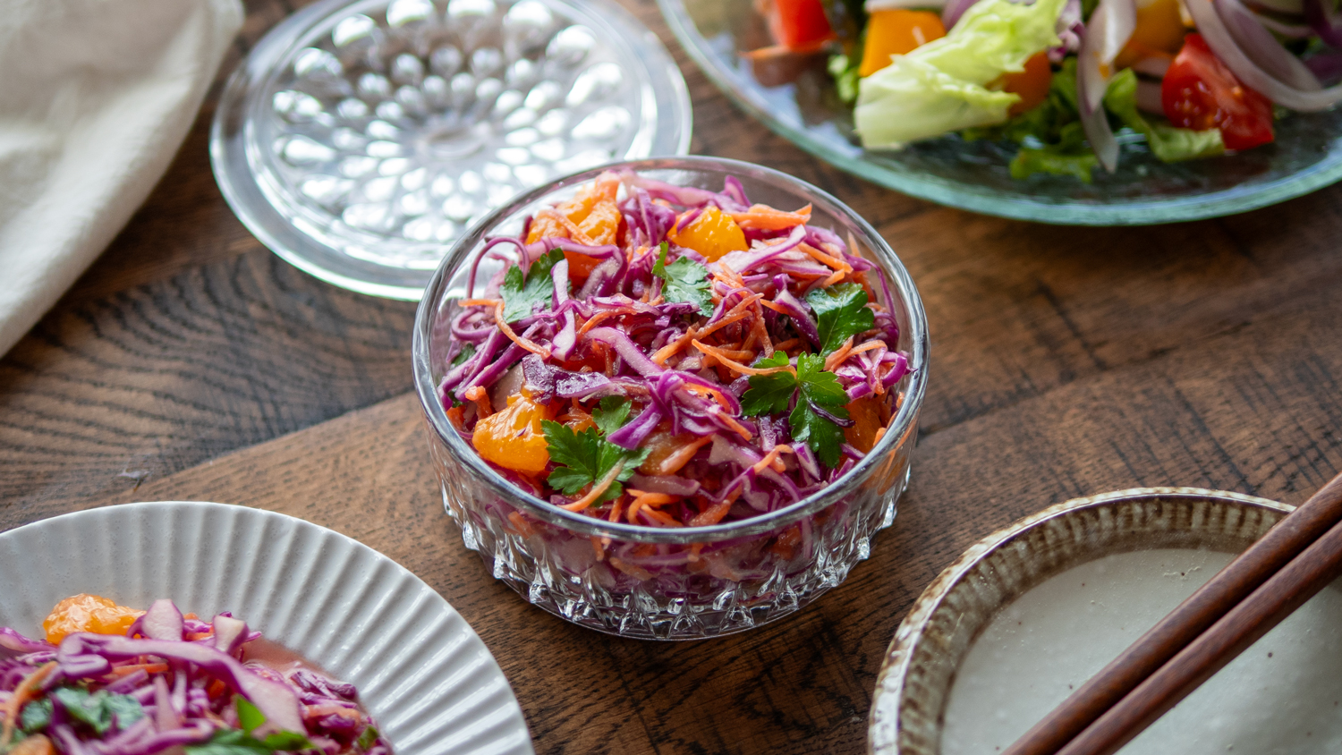 さらに、紫キャベツ特有の鮮やかな彩りはアントシアニンという成分によるもので、日々の献立に多彩な色を取り入れることは、栄養バランスを整える一つの目安にもなります。みかんなどの柑橘類に含まれるビタミンや爽やかな酸味も加わり、体も喜ぶ一皿。特別な材料を使わず、手軽にパッと作れる一品ですので、日々の献立やお弁当のレパートリーとしてぜひ取り入れてみてください。