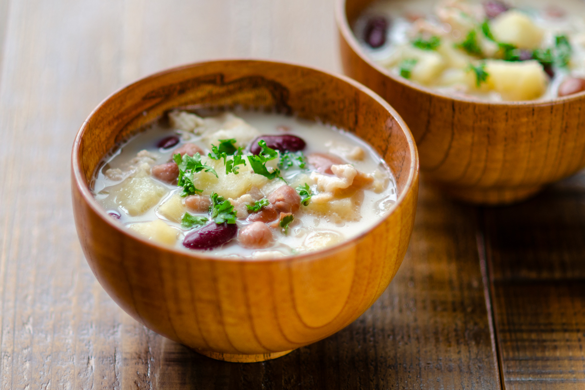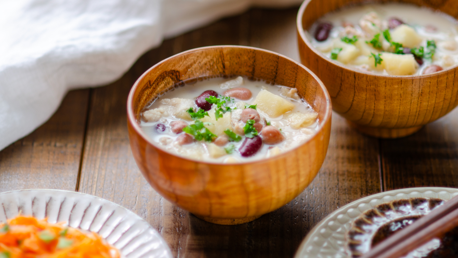 栄養面では、ミックスビーンズやじゃがいもに含まれる食物繊維をしっかり摂れるのが大きな魅力。食物繊維は善玉菌のエサとなり、腸内環境を整える働きをサポートしてくれると言われています。また、豚肉に含まれるビタミンB1などの栄養素も一度にバランスよく摂取できるため、忙しい日の栄養補給にもぴったりです。日々の食事に美味しく取り入れて、体の中から健やかな毎日を目指しましょう。