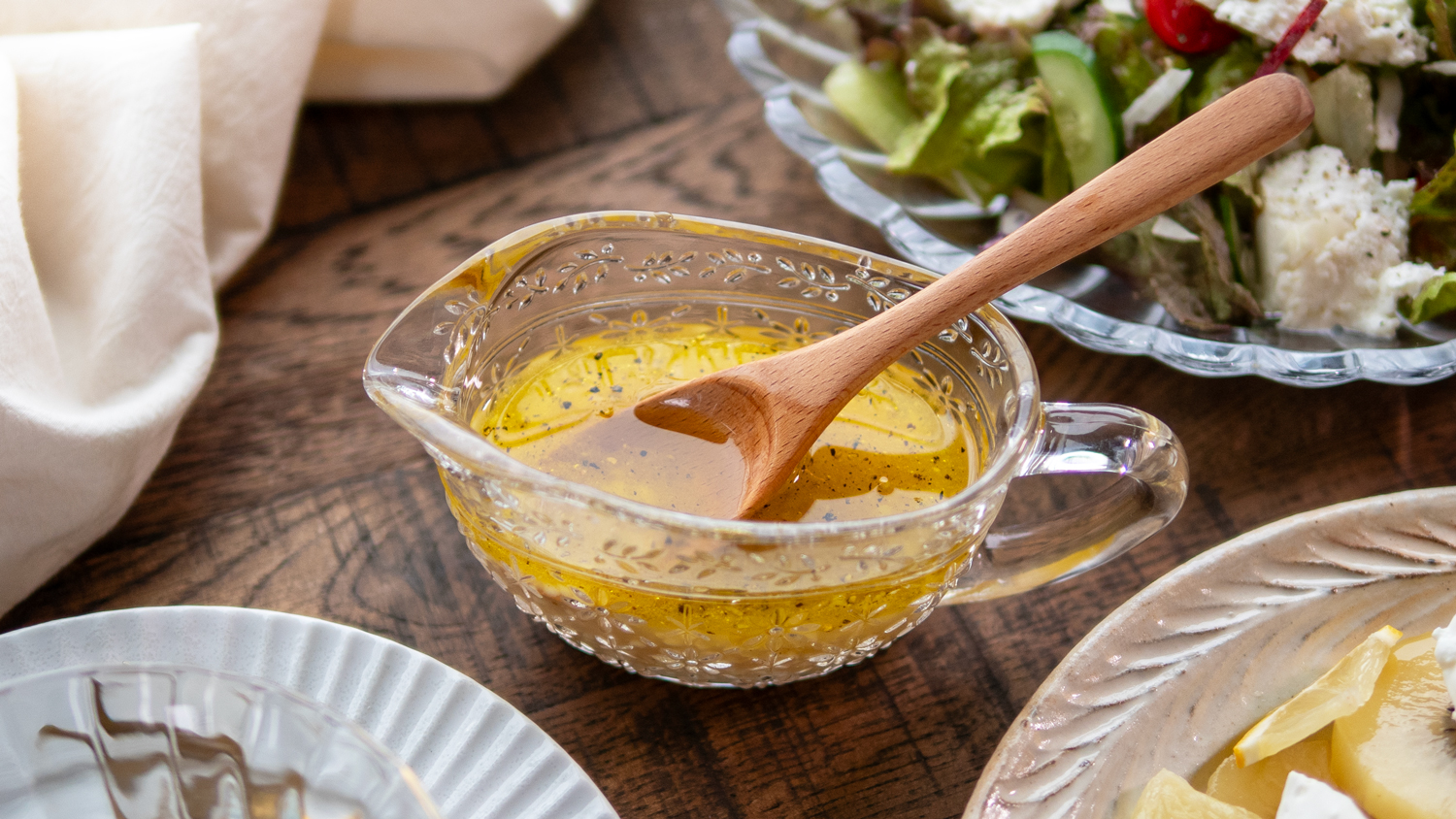 オリーブオイルの代わりに、米油やなたね油、太白胡麻油を使うと、クセのないあっさりとした味わいになります。また、ゴマ油に変えると中華風のドレッシングとしても楽しめます。