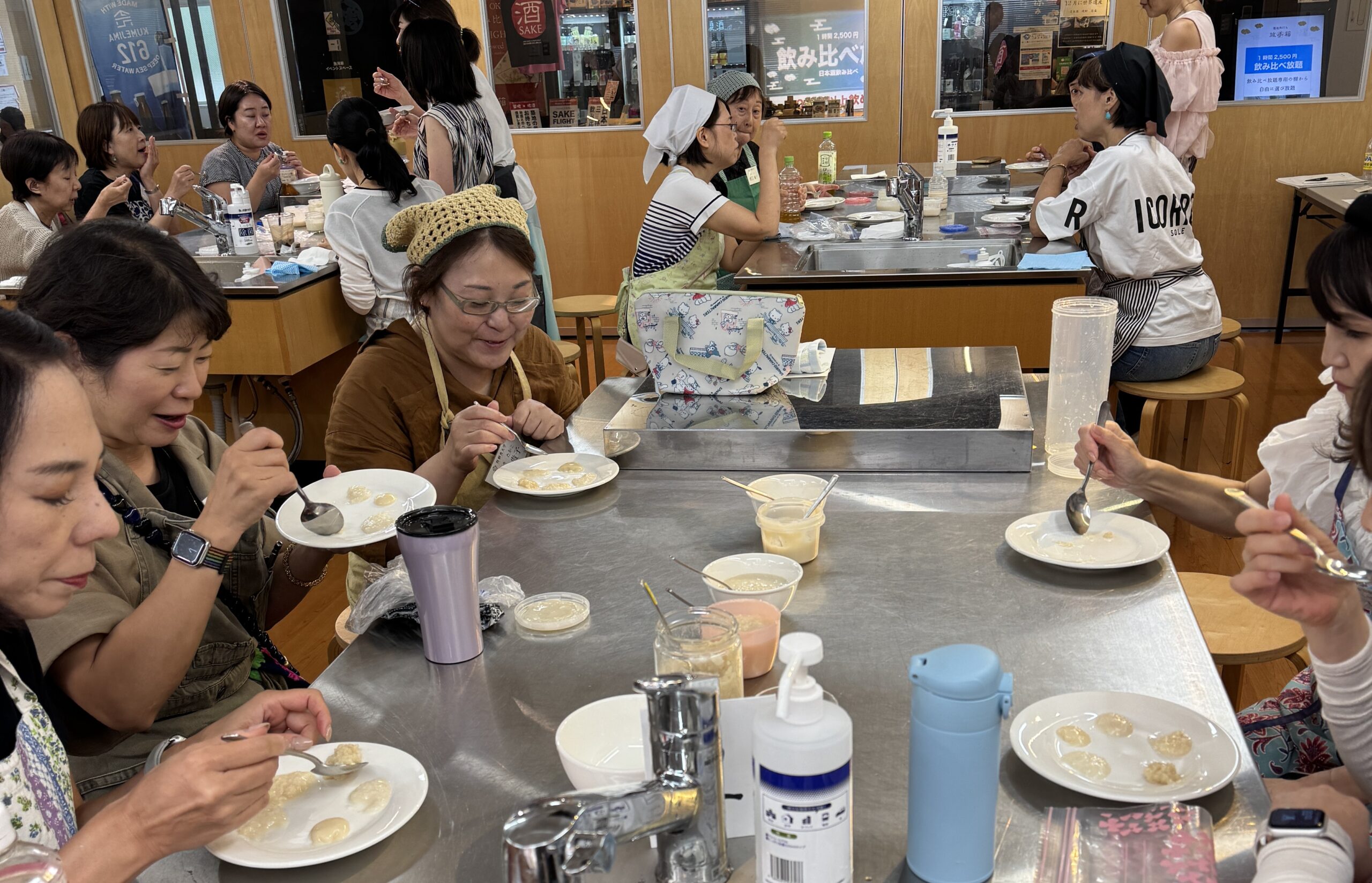 ランチタイムの後は、前回講義「甘酒」の復習として皆で持ち寄った『手作り甘酒』の味くらべをおこないました。使う麹によって味わいも変わる楽しさなど、情報交換がたくさんできました。